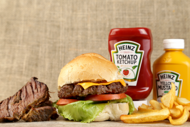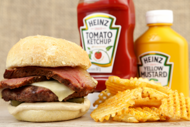 Hambúrguer de costela, queijo cheddar, alface americana, tomate e molho rosé, servido no pão big francês. Acompanha batatas fritas rústicas e uma pequena porção de costela bovina.