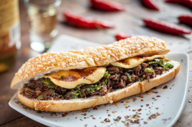 Sanduíche de Barreado: pão com crosta de queijo, barreado, gremolata, queijo colonial derretido e maionese de alho. R$ 18,90