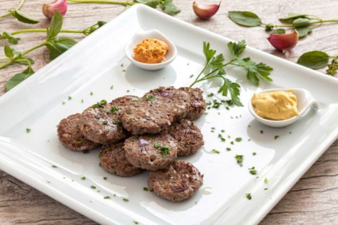 Bolinho Bamboo: bolinho de Carne Fit (carne, aveia, chia e linhaça marrom), com acompanhamento de mostarda Dijon e requeijão de tomate à base de tahine. R$ 15,90