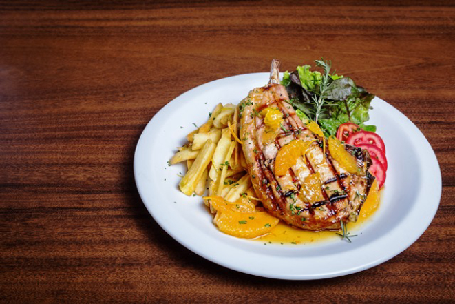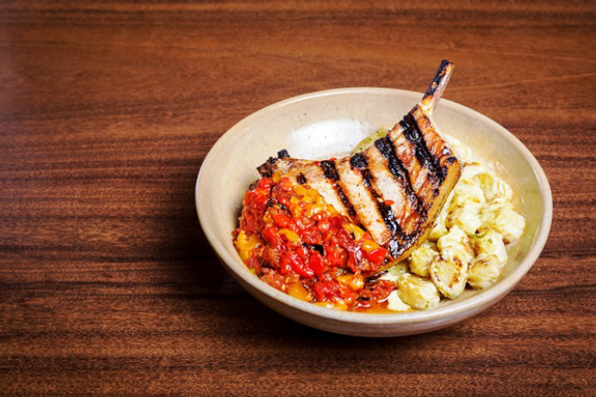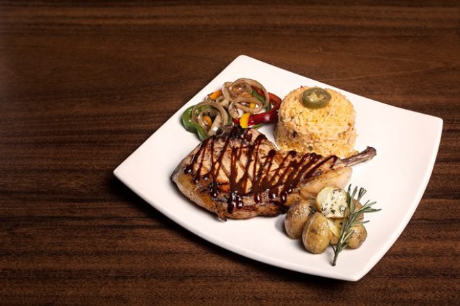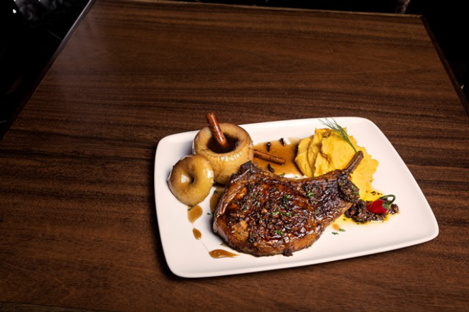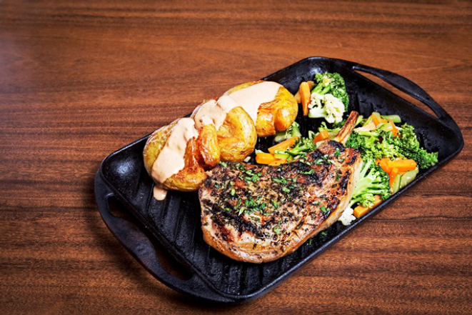 Prime rib suíno cozido lentamente com ervas, grelhado e servido na chapa de ferro, acompanhado de batatas rústicas ao murro cobertas com molho de pimenta defumada e legumes puxados na manteiga.