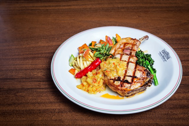 Prime rib suíno ao chutney de abacaxi e tagliatelle com legumes na manteiga.