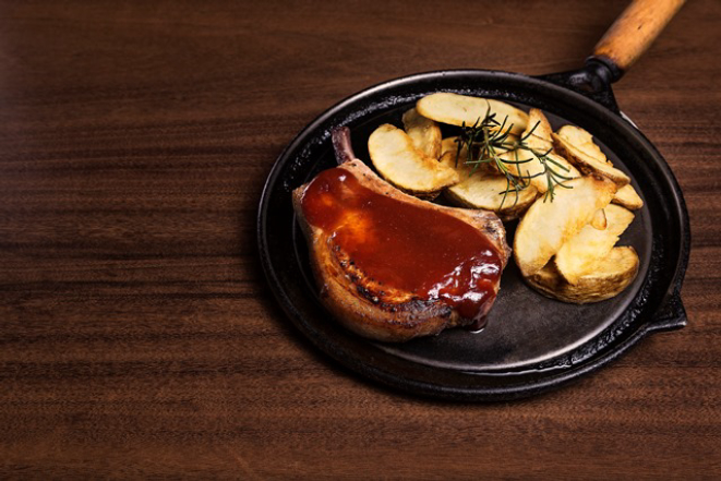 Prime rib suíno grelhado, com molho barbecue caseiro e batatas rústicas com alecrim