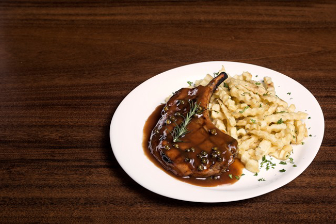 Prime rib regado ao molho demi-glace e pimentas verdes, servido com batatas fritas crinckle e alecrim.