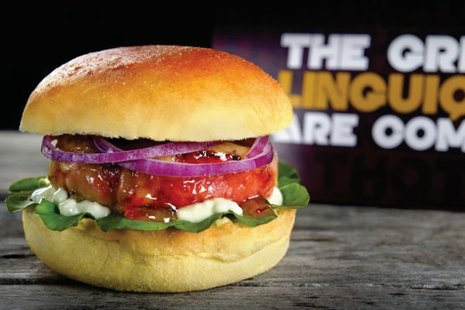 Bizi Burguer – Pão de Limão, Hambúrguer de Lingüiça, Queijo Emmental, Maionese de Ervas, Rúcula, Cebola Roxa e Geleia de Pimenta (R$ 22)