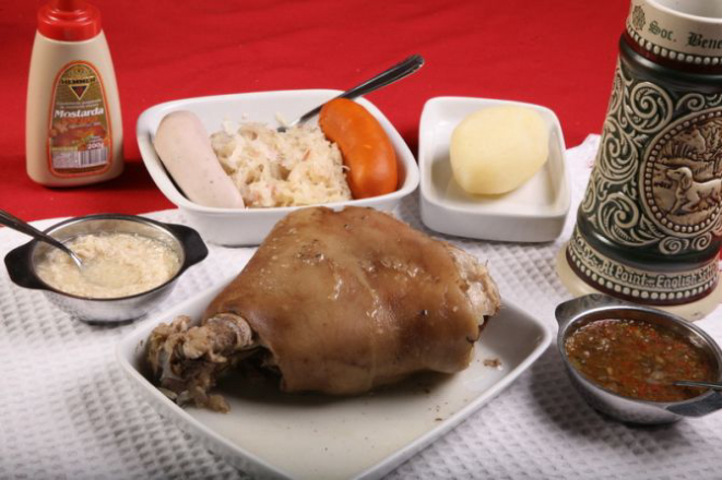 Eisbein cozido com salsicha vermelha, batata cozida e chucrute – R$ 60