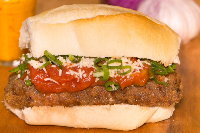 “Bolinho à parmagiana”: Bolinho de carne recheado com presunto e queijo, tomate picado e refogado, parmesão ralado e cebolinha verde, no pão francês.