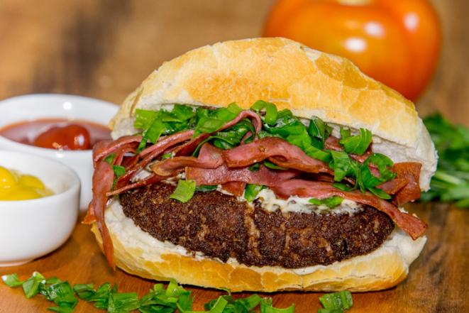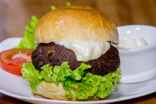 Bolinho de 140 gramas, queijo muçarela, vinagrete ou picles, molho barbecue e maionese da casa no pão francês.