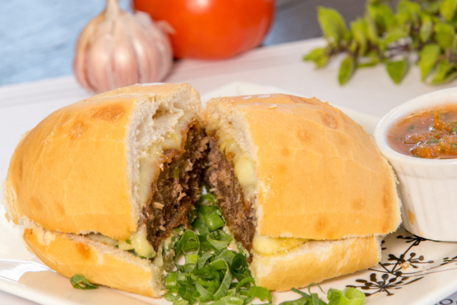 Bolinho misto de carne bovina e linguiça Blumenau (140 gramas), duas fatias de queijo muçarela derretido, maionese de alho caseira, no pão de manteiga, molho chimichurri à parte.