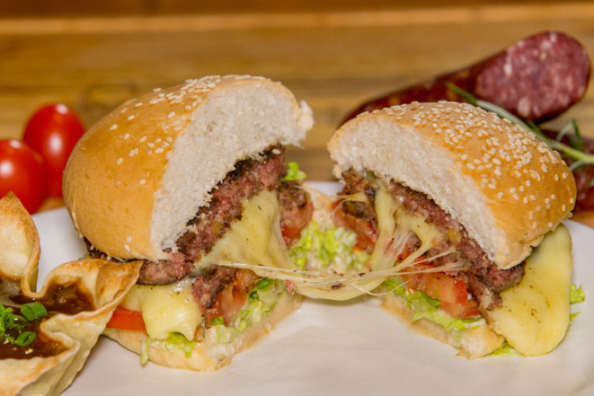 Bolinho com carne moída de primeira com linguiça Blumenau (linguiça temperada e defumada pela casa), recheado com queijo duplo, maionese caseira, alface, tomate, no pão artesanal, acompanha molho barbecue caseiro.