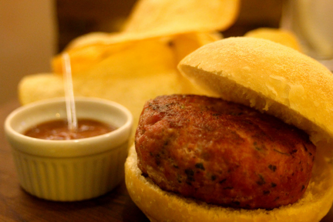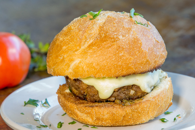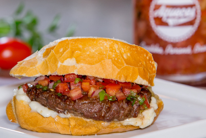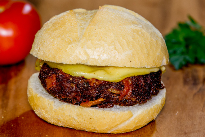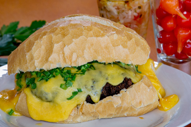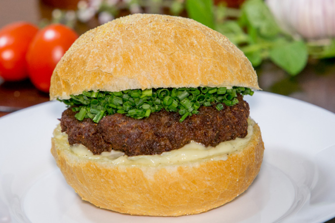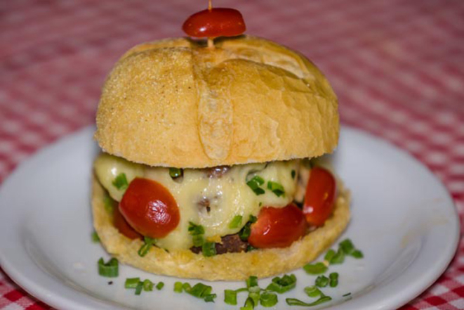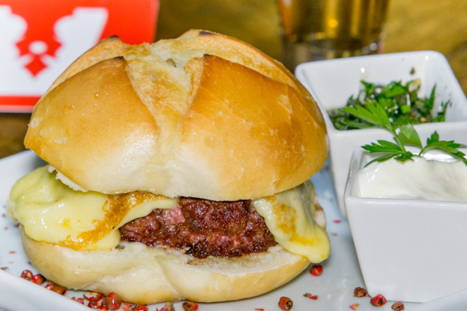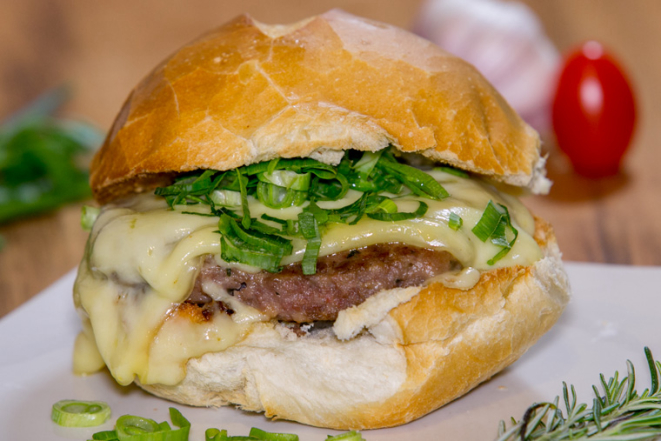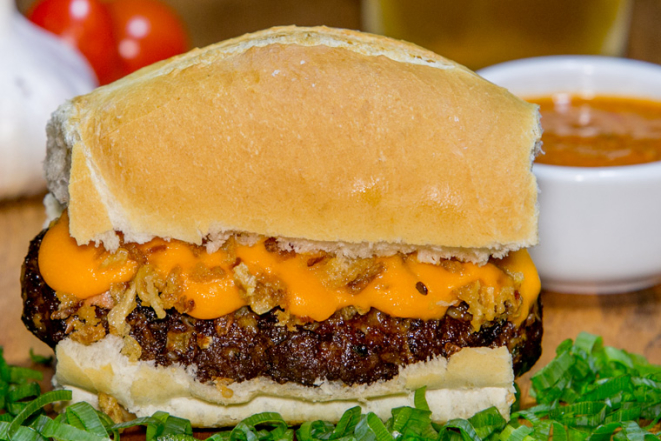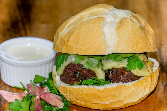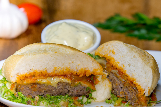 Bolinho misto de carne bovina e linguiça Blumenau (140 gramas), duas fatias de queijo muçarela derretido, maionese de alho caseira, no pão de manteiga, molho chimichurri à parte.