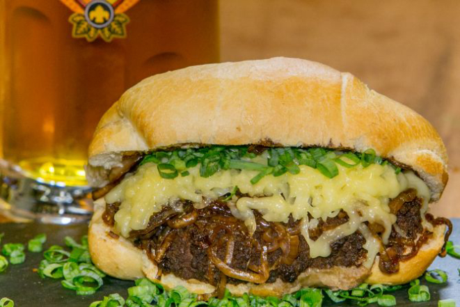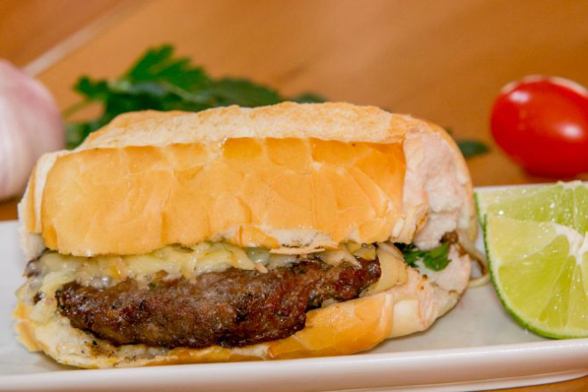 Bolinho de carne especial, cebola salteada no shoyu, muçarela argentina e maionese caseira servido no pão francês.