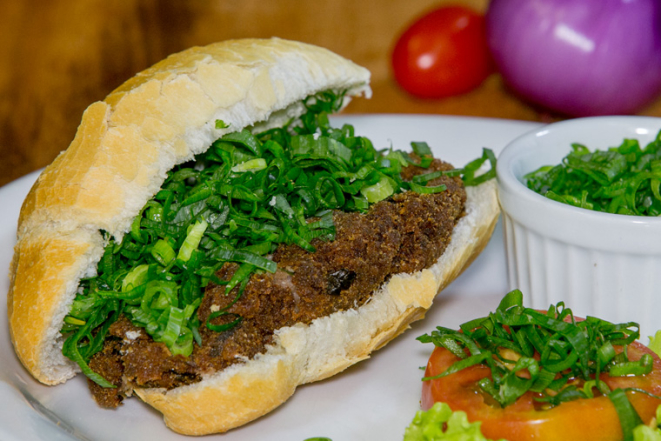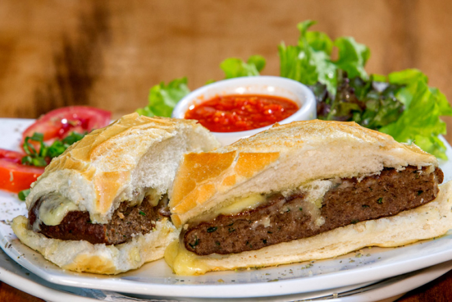 Bolinho misto de carne bovina e linguiça Blumenau, queijo alemão derretido, servido no pão francês, cheiro verde e vinagrete opcional.