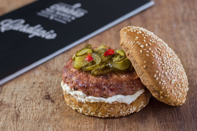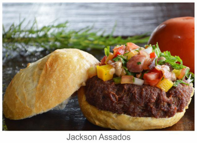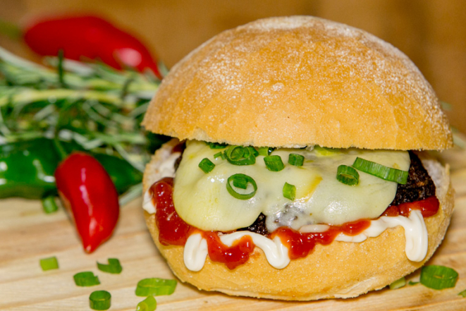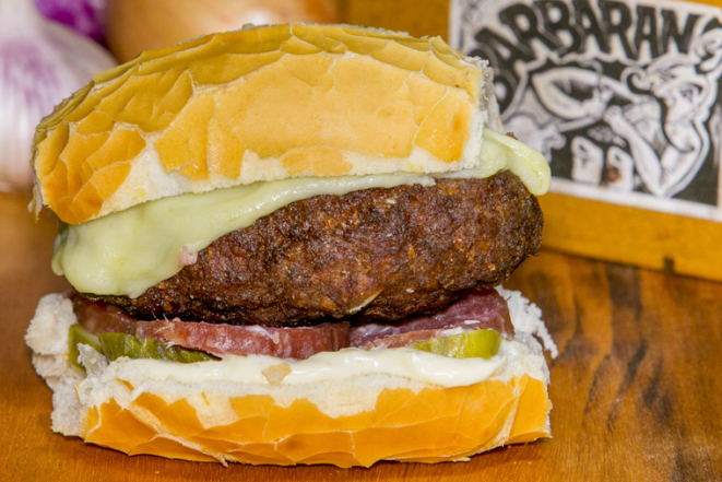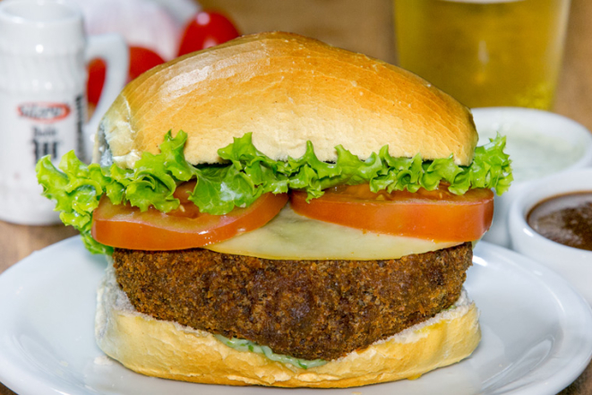 Bolinho de 140 gramas, queijo muçarela, vinagrete ou picles, molho barbecue e maionese da casa no pão francês.