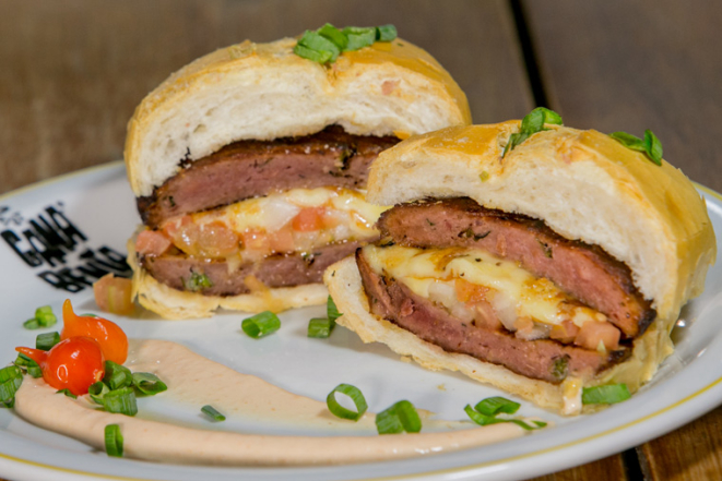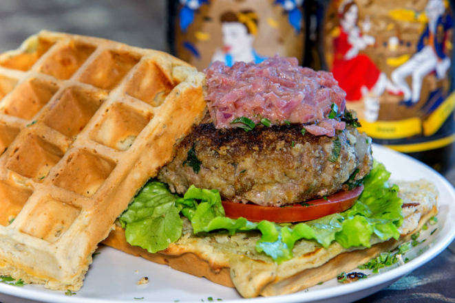 Bolinho de churrasco ao molho de cerveja, empanado com farinha de pretzel alemão, recheio agridoce feito com malte e lúpulo inglês, alface, tomate, molho vinagrete cremoso no pão de wafle.