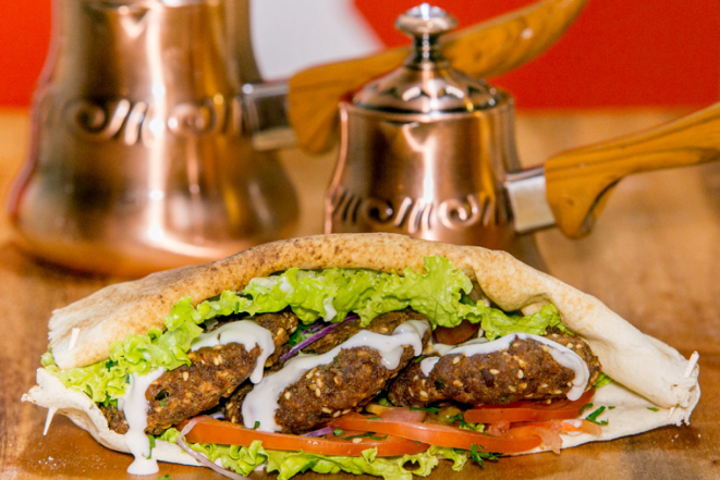 Bolinho de carneiro, tomate, cebola roxa, salsinha, molho tahine no pão sírio.