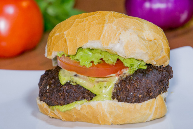 Dois bolinhos, molho verde especial, tomate, alface no pão francês.