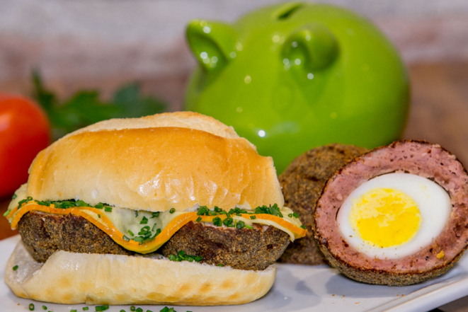 Bolinho de carne suína recheado com ovo cozido, queijo provolone, cebolinha verde no pão francês.