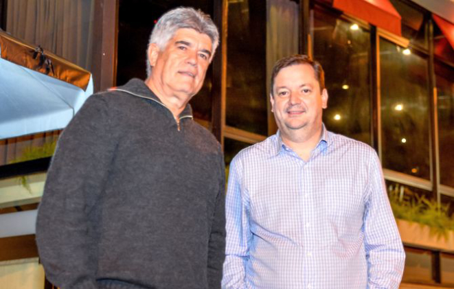 Os empresários Luiz Antônio da Rocha e Edilson José Casagrande, sócio-proprietários do Karbonell, durante a inauguração da segunda unidade do restaurante, localizada no Alto da XV.