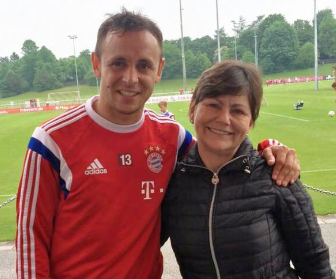 Uma equipe do Schwarzwald Bar do Alemão esteve na Alemanha visitando alguns restaurantes e cervejarias e aproveitou para acompanhar o treino do Bayern de Munique. Selma Tonatto, proprietária do bar curitibano, posou com alguns craques do time alemão e presenteou os jogadores com uma caneca de caipirinha do Schwarzwald. Em troca, ganhou camisas do time e autógrafos. Na foto, Selma com o brasileiro Rafinha.