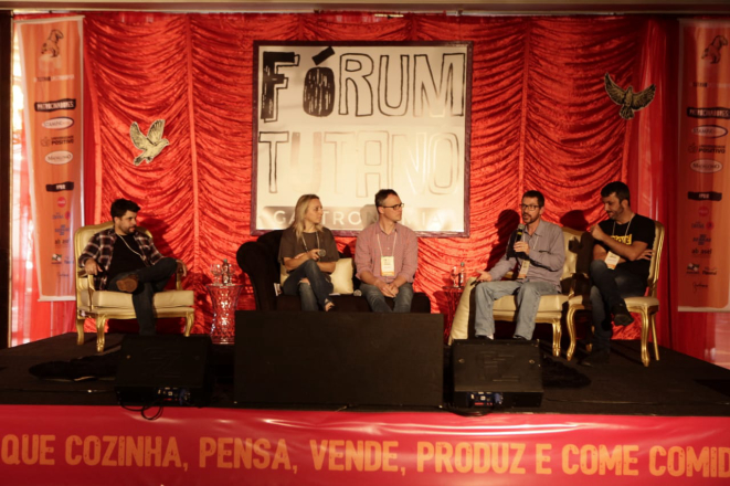 Participaram desta primeira palestra da tarde: Diego Martins, do Caseirinho Queijo Artesanal; Rene Seifert, do Pão da Casa e professor da UFPR; Marson Warpechowski, da UFPR (projeto Porco Moura) e Antônio Amaral, do Iguarias do Mar.