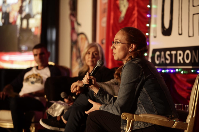 Os quatro discorreram sobre a transformação social que a gastronomia permite. Gabi falou sobre a burocracia que enfrentou para desenvolver seu projeto de arrecadar alimentos em locais como o Ceasa e transformar em alimentação para moradores de rua. “Foi desafiador, mas uma das inspirações foi o Refettorio da Gastromotiva”, contou. “Comer é um ato revolucionário e tentamos mostrar isso para nossos voluntários”.