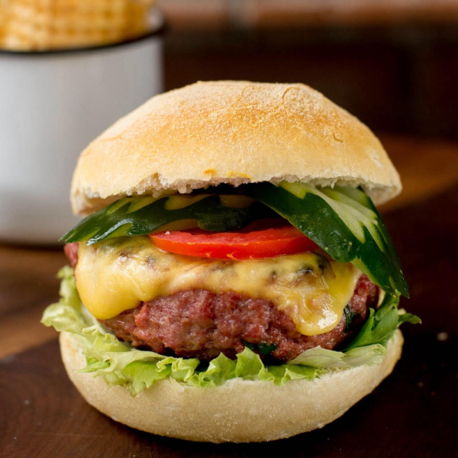 Cheese-Burguer: Hambúrguer de costela (120g), queijo prato e pão artesanal — R$ 12