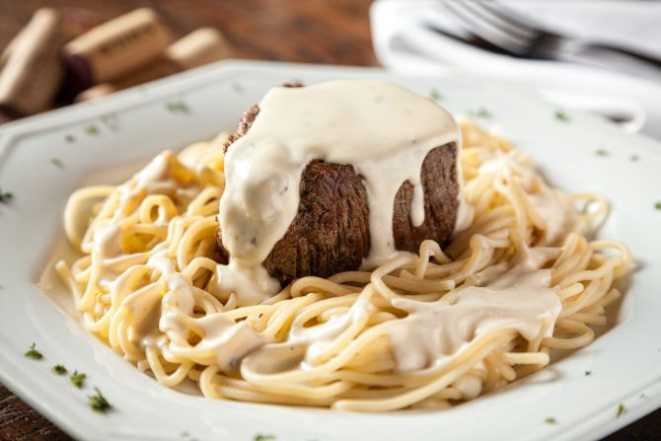 O talharim Alfredo com escalope de mignon de Angus é servido no almoço por R$ 49,90. Pelo valor ainda há a entrada e a sobremesa.