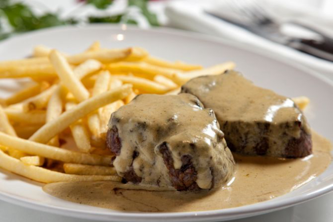 O mignon com molho de mostarda vem acompanhado de fritas. É servido no almoço e no jantar por R$ 49,90, nas unidades ParkShopping Barigüi e Sete de Setembro. Ele é um dos pratos do menu.