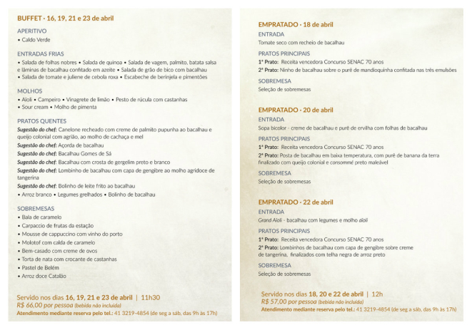 Aproveitando o feriado de Tiradentes, dia 21 de abril, os restaurantes das unidades Foz do Iguaçu e Maringá realizaram um almoço temático. Já na praia de Caiobá, em Matinhos, o evento é realizado de 21 a 23 de abril, durante o jantar. O Restaurante-escola do Senac Curitiba também funciona durante o feriado, na hora do almoço.