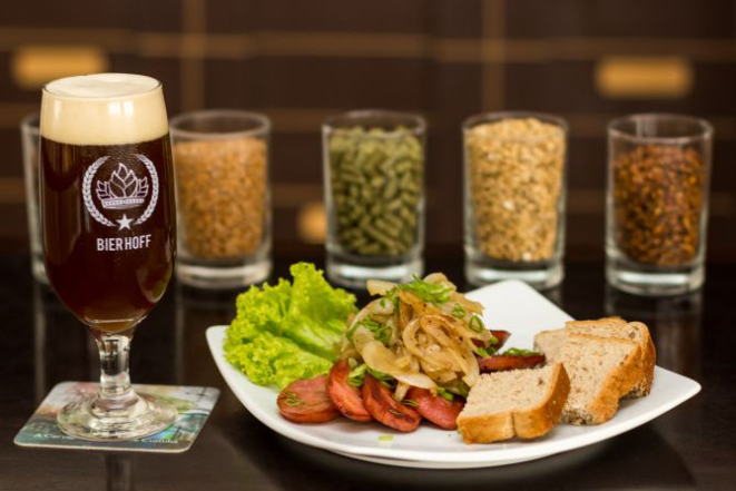 Combo 2 – Calabresa Apa, um pint de Vienna Lager e linguiça calabresa puxada na cebola com molho de cerveja APA.