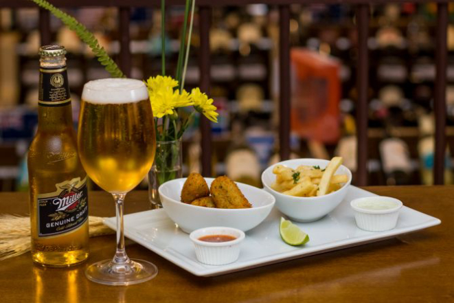 Combo 2 — Catarina, com camarões empanados e fritas com cerveja Miller Genuine Draft LN (355 ml).