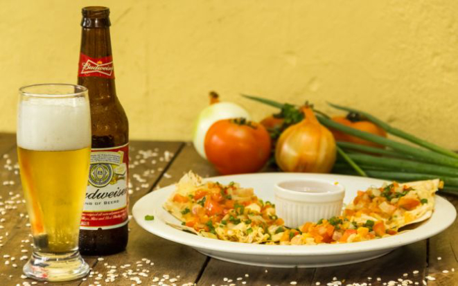 Combo — Long neck de Budwiser com um pão crocante recheado.