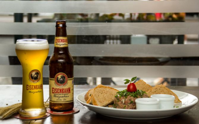 Combo 2 — Alemão, com chope Pilsen (300 ml) e uma porção de salsichas brancas e vermelhas alemãs.
