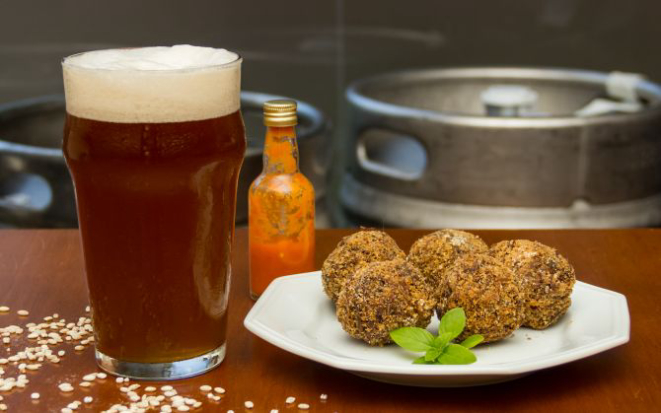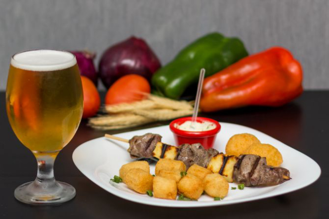 Combo 3 – Veg Espeto, chope red ale ou large (400 ml), espetinho de proteína de soja com legumes e bolinhos de mandioca e parmesão.