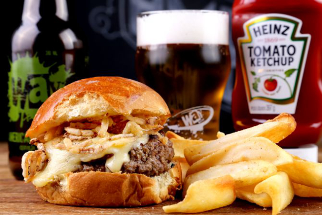 Beer Hot: Pão macio, hambúrguer de Angus (200 g), bacon, jalapeño, muçarela, cebola na cerveja artesanal, maionese, alface e tomate. Acompanhamento: Batata frita, batata rústica ou orion rings.