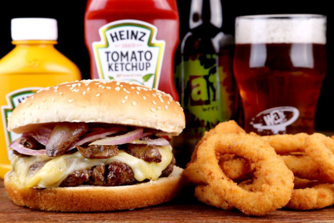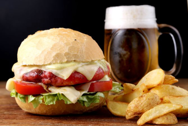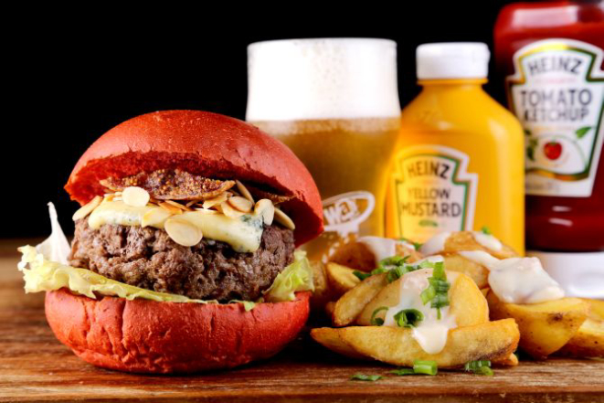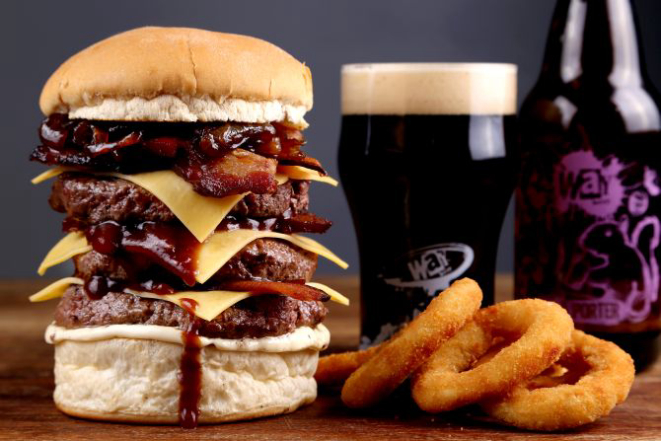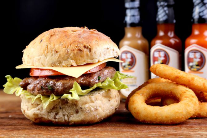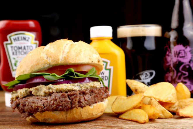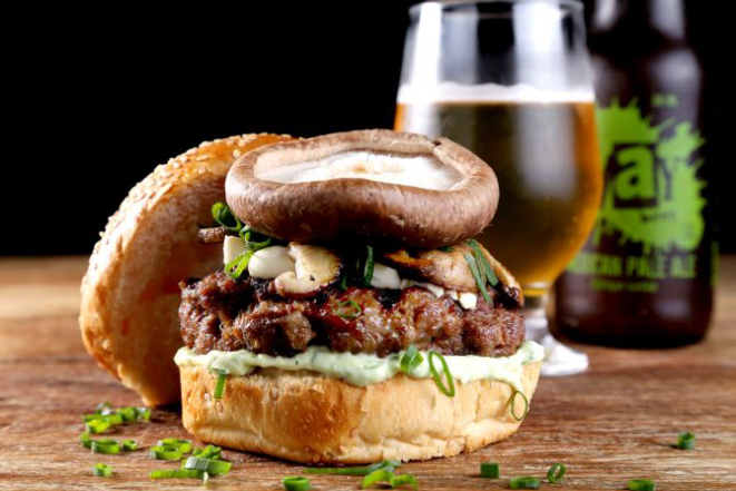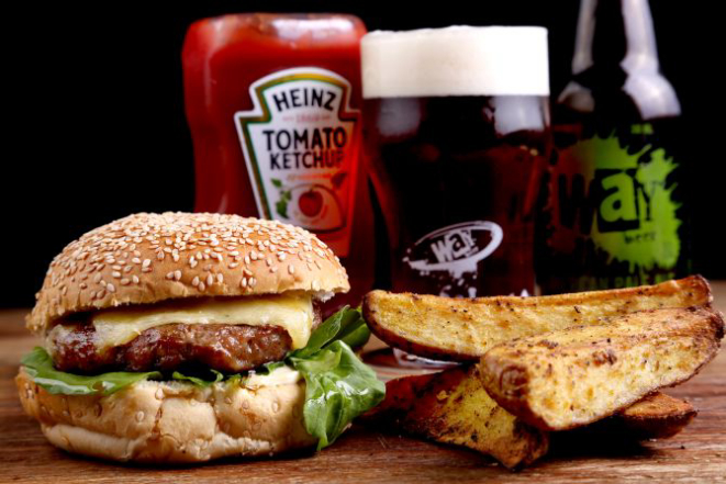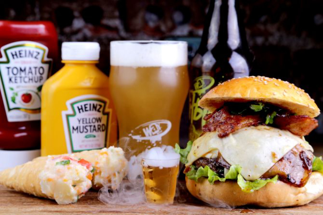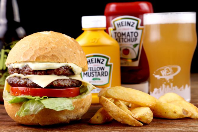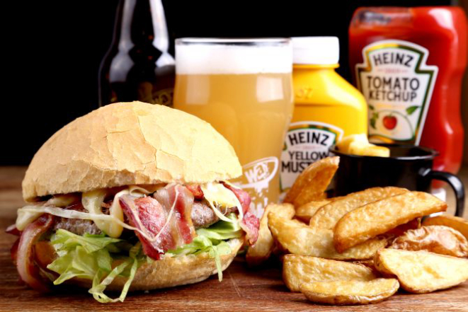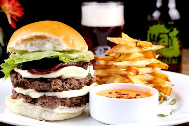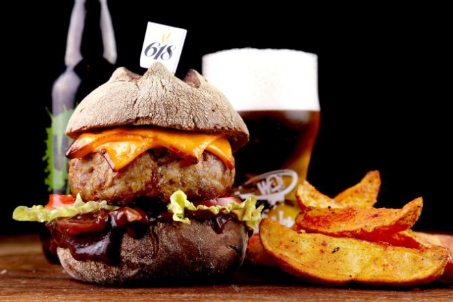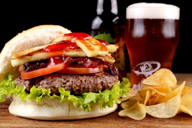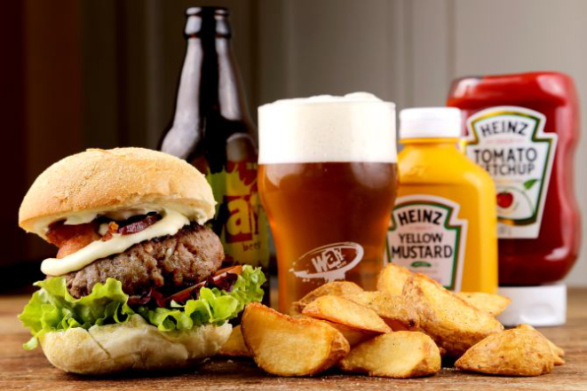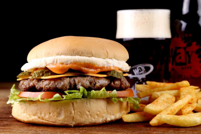 Beer Hot: Pão macio, hambúrguer de Angus (200 g), bacon, jalapeño, muçarela, cebola na cerveja artesanal, maionese, alface e tomate. Acompanhamento: Batata frita, batata rústica ou orion rings.