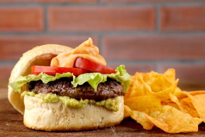 Hambúrguer mexicano: Hambúrguer sobre camada de guacamole e queijo picante. Acompanhamento: Doritos.