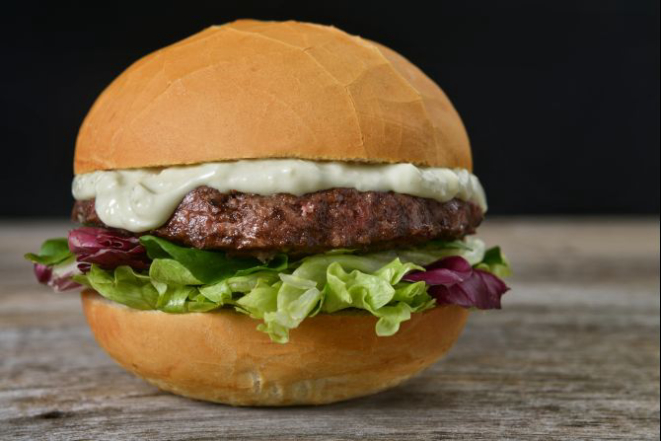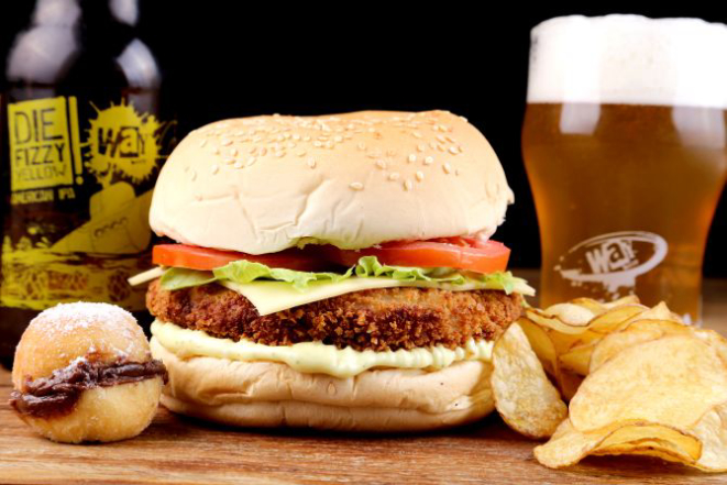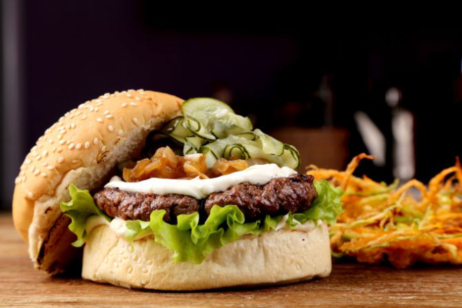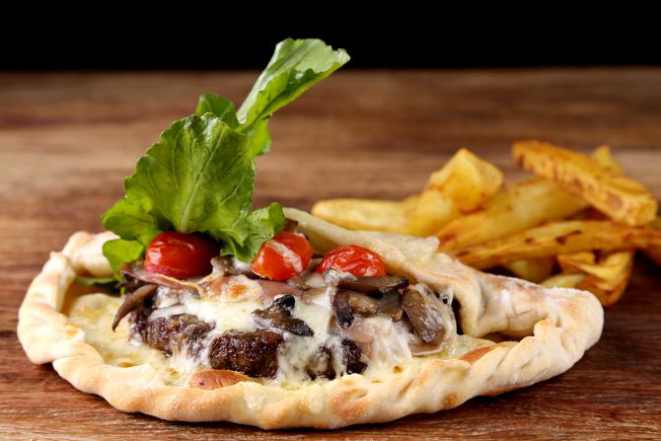 Pepperoni Veggie: Brioche ou pão da casa com hambúrguer de legumes com emmenthal derretido, pepperoni vegetariano, rúcula e maionese de leite com mostarda Dijon. Acompanhamento: Batatas rústicas ou aipim frito.