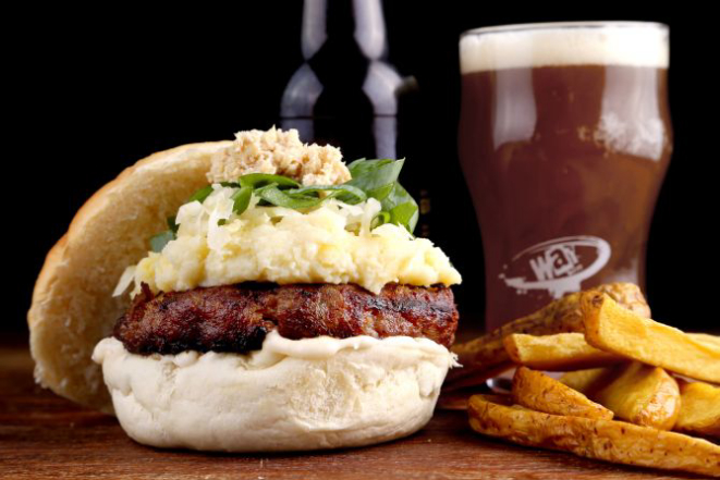 Feed my Frankenstein: Hambúrguer de pernil com cracóvia, brie, requeijão e rúcula. Acompanhamento: Batata rústica.
