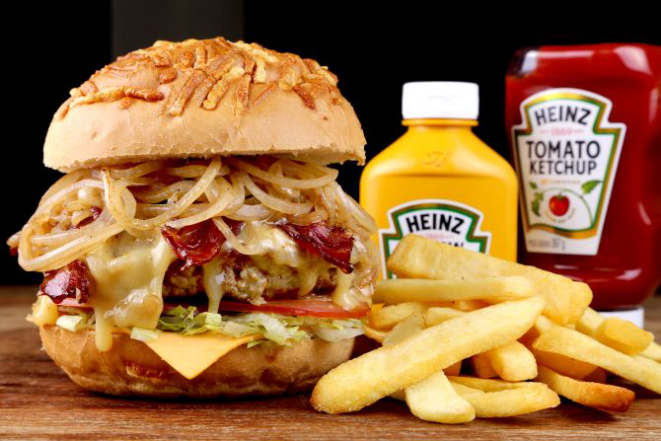 Viking: Pão, hambúrguer de costela (200 g), muçarela, pedacinhos de coração, cebola roxa e um molho mostarda e mel. Acompanhamento: Onion rings.