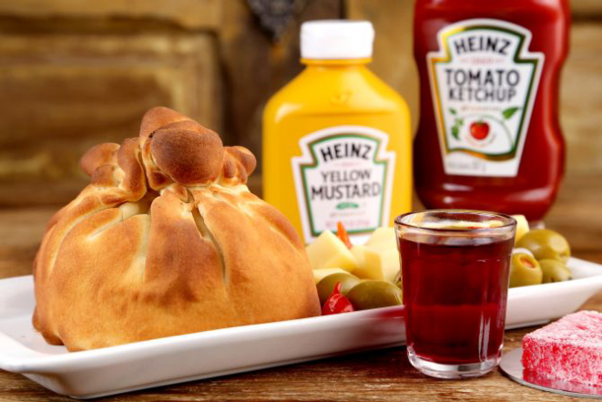 Emoción: Hambúrguer bovino (180 g), calabresa, bacon e cebola refogados com cerveja preta, muçarela, tomate e requeijão cremoso, envolto em massa de pizza e assado no forno à lenha. Acompanhamento: Picles, azeitonas e queijo, um copinho (50 ml) de quentão de vinho e gelatina de pinga.