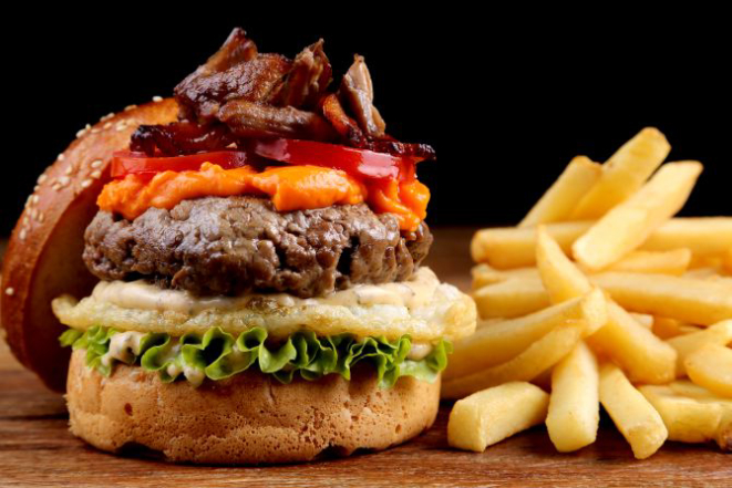 O retorno do monstro: Pão de hambúrguer, hambúrguer bovino (150 g), costelinha de porco desfiada, ovo frito (gema dura), bacon frito, tomate, alface, molho especial. Acompanhamento: Batatas fritas.
