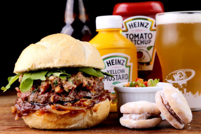 Tesoureiro: Pão crocante, cebola caramelizada, hambúrguer de costela, linguiça Blumenau gratinada com quatro queijos e rúcula fresca. Acompanhamento: Molho campeiro e alfajor.