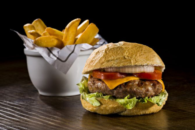 Steak Burger Picanha: Hambúrguer de picanha (160 g), pão tradicional, cheddar, alface americana, tomate, relish de pepino e molho especial. Acompanhamento: Batata frita tipo caseira com páprica.