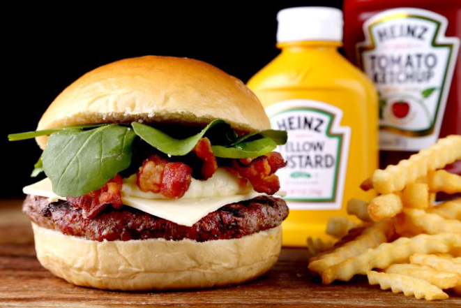 O Campeão: Pão de mandioquinha, hambúrguer de Black Angus (200 g), pepino agridoce, tomate quente, cebola chapeada, queijo emmenthal, farofa de parmesão e cebola crocante e maionese Fábrica. Acompanhamento: Batatas fritas e molho barbecue Fábrica.