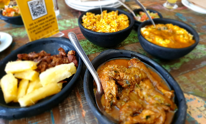 No Flor de Mandacaru, a entrada contou com petisco de bode com macaxeira, ambos crocantes e perfeitos para preceder o prato principal – a Galinha de Capoeira, acompanhada de arroz, feijão de corda e xerém, que é um prato de origem portuguesa, uma espécie de mingau à base de farinha de milho, e baião de dois composto por feijão-de-corda, arroz, queijo coalho, manteiga de garrafa, coentro e nata.
