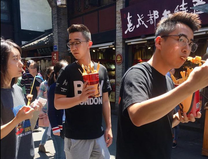 A China conta com uma gastronomia rica em sabores, temperos, aromas, uma culinária hoje reconhecida mundialmente, e a província de Sichuan, a qual residimos, é um dos polos renomados e disseminadores das receitas que tanto encantam o mundo. Os restaurantes tomam conta da cidade, das grandes calçadas e pontos turísticos, e junto deles, junto dos cardápios mais requintados, seguem os casuais e apaixonantes espetinhos.