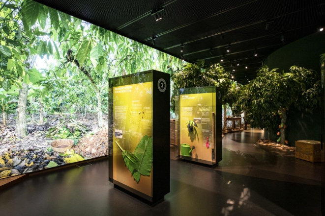 De lá, a parada é no espaço que fala do percurso do chocolate da cultura maia e asteca à Europa, onde chegou por meio dos espanhóis, ainda à época das grandes navegações.
