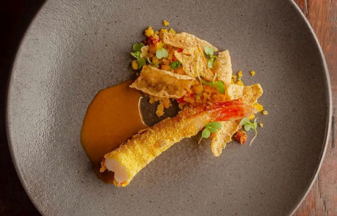 O camarão empanado, tal como o shot de boas-vindas, é uma homenagem rasgada ao milho, presente no fubá que forma o empanado do marisco, no cuzcuz - um dos pratos mais emblemáticos no nordeste brasileiro e muito consumido, vejam só, no café da manhã - , milho assado e tuille de milho criolo, tudo isso acompanhado pelo bisque super intenso e saboroso. Sabe aqueles pratos que você começa comendo pelos olhos? Esse, certamente, cumpre esse pré-requisito. A cerâmica grafite fez as vezes de tela para a intensidade das cores e sabores experimentados.