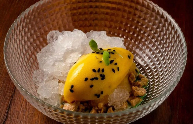 Já completamente envolvida com a baianidade dos ingredientes, a orquestra de sabores chegou ao intermezzo, pedindo passagem à sequência de sobremesas com um preparo refrescante de manga verde com sal, gergelim negro e azeite, com granita de água de coco, que coube perfeitamente no papel de limpar o paladar para o que estava por vir.